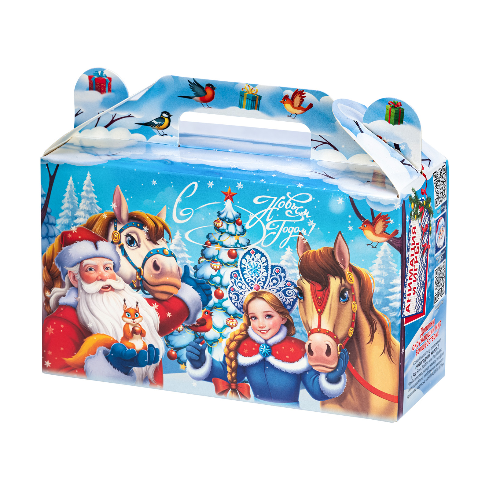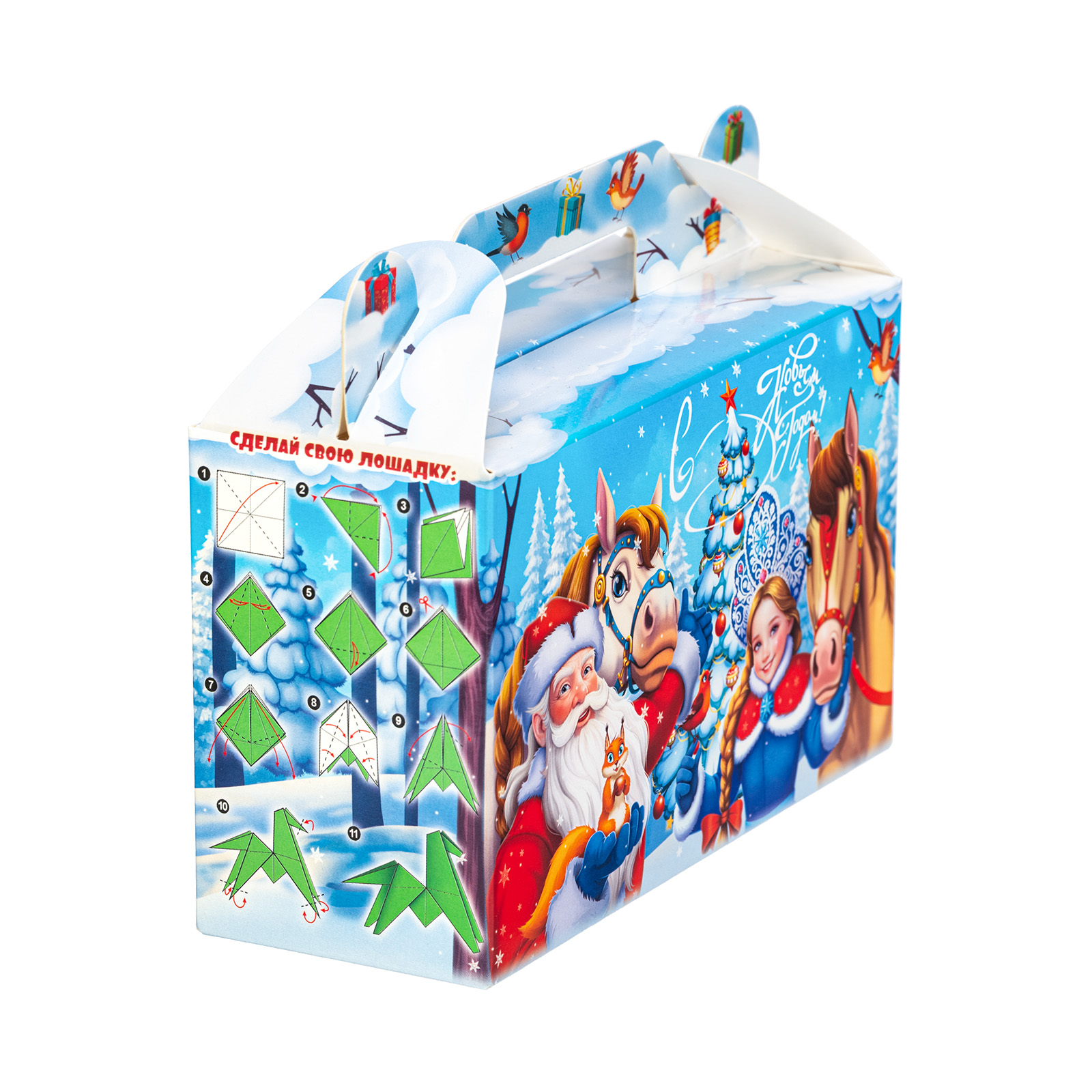 Новогодний сладкий подарок должен быть не только вкусным, но и привлекательным. Именно таким и является подарочный набор “Дружная команда”! Это компактный подарок в традиционной картонной упаковке в форме небольшого чемоданчика. На нежно-голубом фоне изображена картина роскошного снежного леса. На передней части упаковки мы видим главных действующих лиц - Дедушку Мороза, Снегурочку, грациозных лошадок и парочку лесных зверят. Вся дружная компания приветливо смотрит на нас и приглашает присоединиться к праздничному чаепитию с вкусными сладостями, которые бережно хранятся в этом замечательном чудо-сундучке.