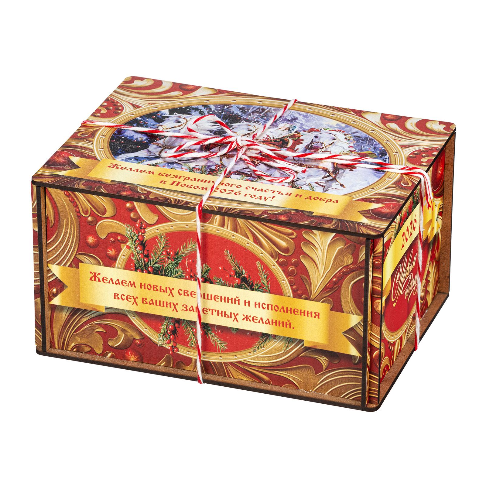 Интересный вариант новогоднего подарка – «Золотые узоры (большая) Легенды Москвы». Он представлен в разделе Дерево. Отлично подойдет на подарок в 2026 году с символом Лошадь. Внутри такого презента находится кондитерский набор весом 1500 граммов.